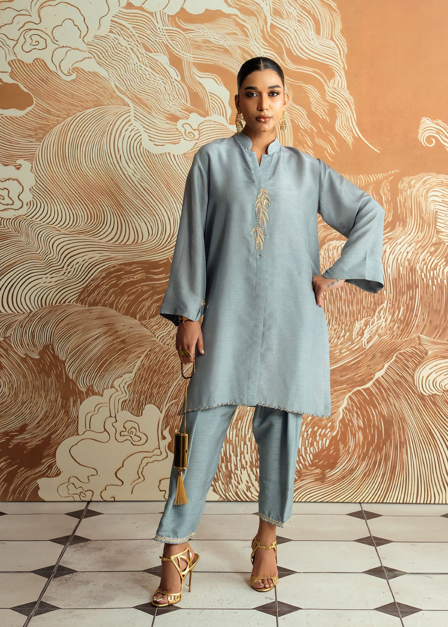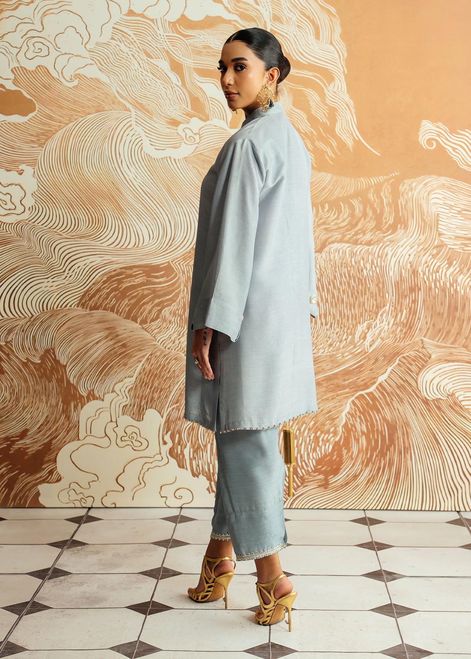 A serene grey kurti in Korean raw silk with matching trousers, delicately uplifted with Mahgul’s signature handwork. The ensemble radiates quiet sophistication and contemporary charm, crafted to bring timeless elegance with effortless ease.
