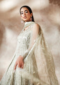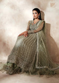 This regal outfit rendered in a beautiful shade of mint green on organza for shirt and sheesha silk for lehnga to add the fusion touch to the contemporary shirt, with heavy embellished intricate details. The timeless look is completed with a net sequin dupatta.