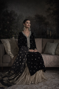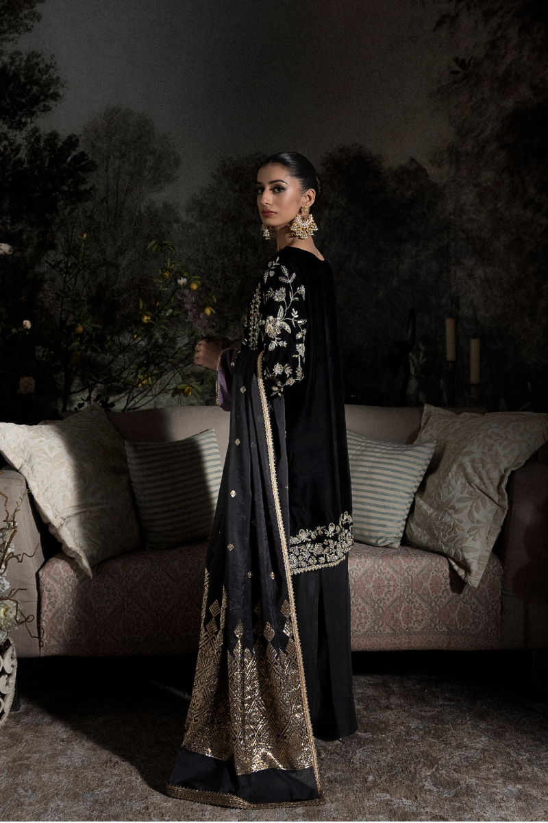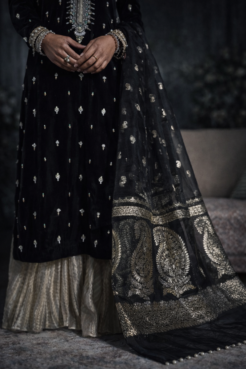 The crushed tissue sharara adds fluidity, while the brocade organza dupatta completes the look with structure and depth.