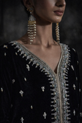 This look brings together a velvet shirt finished with statement crystal detailing, designed to feel rich without being overwhelming.