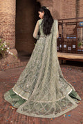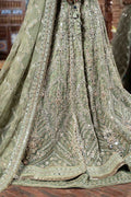 Sarai' - a testament of regal splendor! Featuring a glorious sea green canvas with an enchanting array of intricate patterns woven with exquisite mirror work, creating a striking composition with kundan & dabka naqshi work surrounded by elegantly crafted 3D florals. This piece is the hallmark of sophistication & a perfect choice for a nikah & walima look.