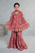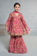 Style your little one glamorous with our 3 piece embroidered lawn suit; featuring a mesmerizing floral printed panel angrakha frock framed with sequins and tilla embroidery, delicate tassels, and tilla balls embellishment. It is paired with floral printed gharara elevated with sequin-tilla embroidery on the hem and a crushed dupatta detailed with kiran on borders, making it a statement choice for all your summer affairs.