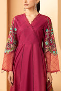 Lawn schiffli frock with embroidered sleeves and lace details on neck and ghera. Paired with lawn trouser and printed chiffon dupatta