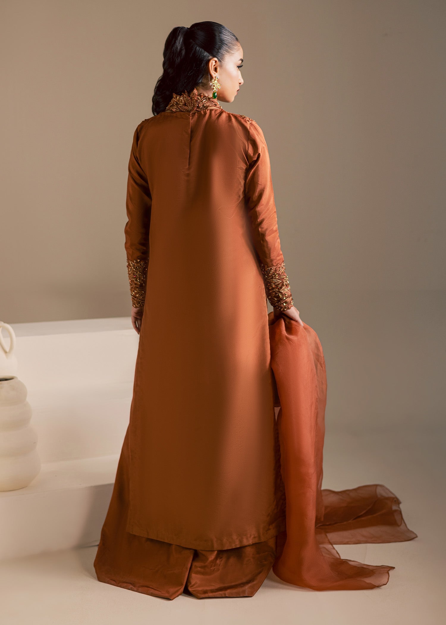 Given our Pakistani cultural background, we understand the significance of modesty. Therefore, we may make adjustments to certain design elements for modesty reasons. Examples of modifications include transforming low backs into traditionally styled regular backs, replacing drop shoulders with normal shoulders, concealing exposed stomachs, and attaching sleeves to sleeveless dresses.