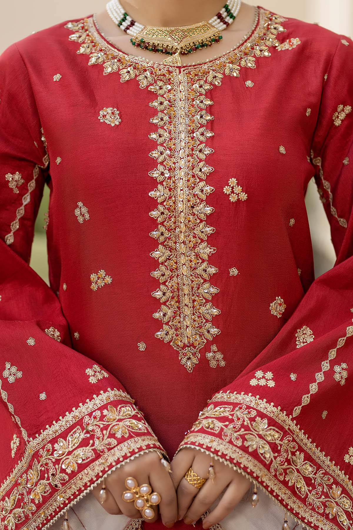 Given our Pakistani cultural background, we understand the significance of modesty. Therefore, we may make adjustments to certain design elements for modesty reasons. Examples of modifications include transforming low backs into traditionally styled regular backs, replacing drop shoulders with normal shoulders, concealing exposed stomachs, and attaching sleeves to sleeveless dresses.