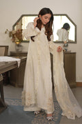 Grace meets elegance in this white 3-piece pret ensemble, tailored in flowy grip fabric for a timeless silhouette. The A-line shirt features a flattering round V neckline with delicate tassel detailing, finished with motif appliqué on the hem for added charm. Embroidered sleeves adorned with pearl accents lend a soft, feminine touch. Paired with a basic flared trouser for a graceful finish. The look is perfected with a net dupatta, beautifully framed with four-sided embroidered borders. Ideal for festive affairs or refined daywear.