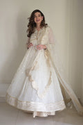 Grace your wardrobe with this ethereal white 3-piece pret set, featuring a delicately embroidered net shirt with a flattering V-neck and fancy button detailing. The flared silhouette is enhanced by a soft floral spray and finished with intricate embroidered borders and lace accents. Fitted sleeves with button-detailed cuffs add a touch of refinement. Paired with flared grip pants, styled with a chic fancy fabric border at the hem. Completing the look is a net dupatta, beautifully embroidered and edged with elegant four-sided scalloped borders. A perfect blend of grace and elegance for festive days.