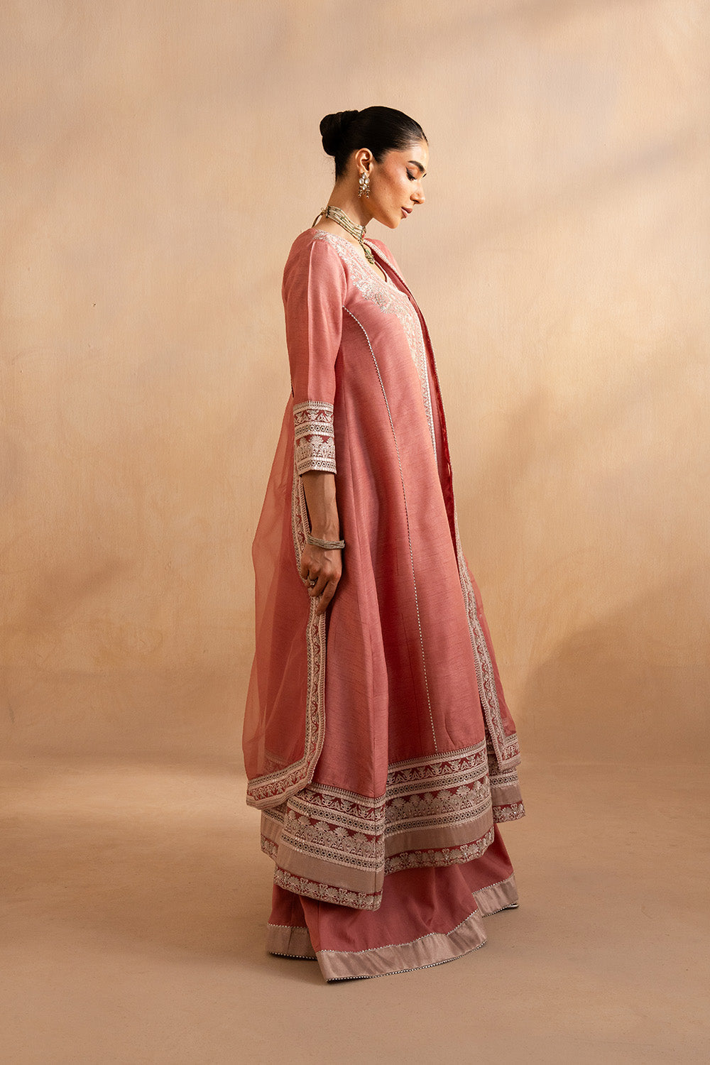 Make a graceful statement in Salmon Pink with this 3-piece pret outfit, featuring a Korean Raw Silk and Organza shirt, complemented by a sleek Plain Grip trouser. The sheer Organza dupatta addsthe perfect hint of sophistication to your look.