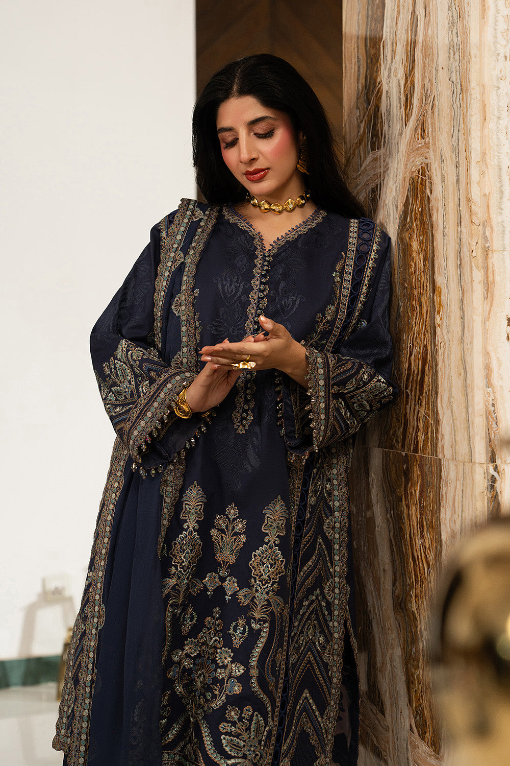 Indulge in timeless elegance with this Navy Blue 3-piece prêt ensemble, designed to make a refined statement. The lawn shirt showcases a beautifully embroidered round neckline with a slit, finished with loops and embroidered buttons, while fully embroidered panels are delicately joined with lace for added dimension. Flared embroidered sleeves with pearl-detailed cuff borders enhance its graceful charm. Paired with flared trousers featuring a wide organza embroidered hem and a georgette chiffon dupatta framed with four-sided embroidery, this look radiates sophisticated allure.