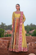 Introducing our exquisitely crafted bridal masterpiece—a symphony of vibrant colors and intricate embellishments. This luxurious ensemble features a rich yellow bodice adorned with delicate gold embroidery and sequins, cascading into a mesmerizing multi-hued flare with ornate detailing. Complemented by a bold fuchsia pink dupatta, this statement piece radiates regal elegance, making it the perfect choice for a bride who wants to dazzle on her special day.