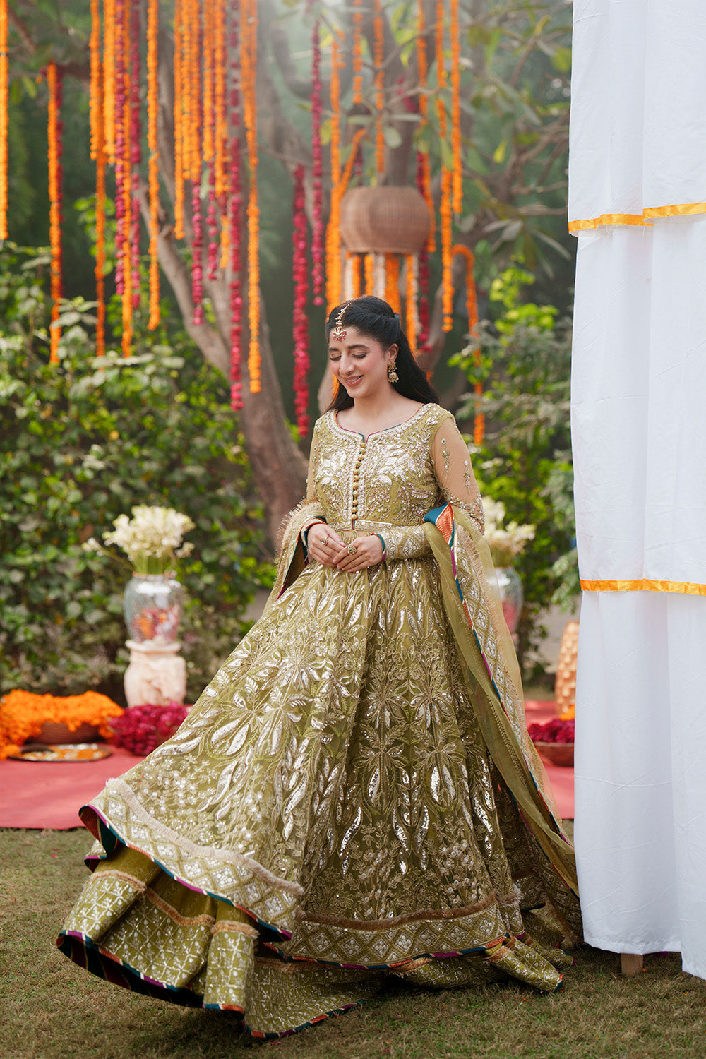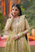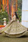 Step into regal sophistication with this stunning 3-Piece Pret ensemble in a rich Olive Green shade. The flowing Bareeze Net maxi features a round neckline with slit, enhanced with delicate chatta patti on the edges, fabric loops, and embroidered buttons. A fully embroidered bodice with intricate adda work flows seamlessly into heavily embroidered kalliyan for a striking silhouette. The maxi is finished with a wide embroidered border on one side, edged with kiran lace piping for refined elegance. Fitted sleeves are adorned with embroidery borders at the cuffs, completed with matching piping detail. Paired with a hand-printed grip lehnga, featuring a wide embroidered border on the hem, also finished with piping for a polished touch. Completing the ensemble is a fully embroidered Bareeze Net dupatta, framed with four-side embroidery borders and kiran lace edged piping, exuding timeless charm.