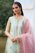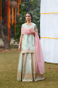 Embrace ethereal elegance with this exquisite 3-Piece Pret ensemble in a refreshing Mint Blue hue. The luxurious Zari Tissue shirt features a round neckline with a slit, richly adorned with intricate adda work detailing. An all-over embroidery spray is complemented by heavy embroidered borders along the sides and hem for a regal finish. Fully embroidered half sleeves are elevated with delicate scalloped borders and graceful pearl tassels. The flared Zari Tissue lehnga showcases multi-tissue kalliyan, lavishly embroidered with sequin work. Heavy embroidered borders with scalloped edging enhance the lehnga’s flowing silhouette. A contrasting Organza dupatta, finished with all-over embroidery spray and four-side scalloped embroidered borders, completes this statement look.