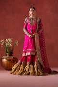 Unveil timeless elegance in this fuschia 3-piece pret ensemble, crafted to elevate every festive moment. The A-line Georgette Chiffon shirt dazzles with full adda embroidery, framed by an embroidered border and a round neckline with a delicate keyhole and dorri tassel. Its sleeves echo the luxury with fully fitted adda work, adding refined charm. Paired with a hand-printed Farshi sharara inSilk and Zaari Tissue, it features an embroidered border and a lush crushed-tissue finish at the hem. The look completes with a dreamy Bareeze net dupatta, adorned in an all-over botti spray and finished with an embroidered border and kiran lace. A radiant fusion of artistry and modern glam perfect for celebrations that demand a statement.