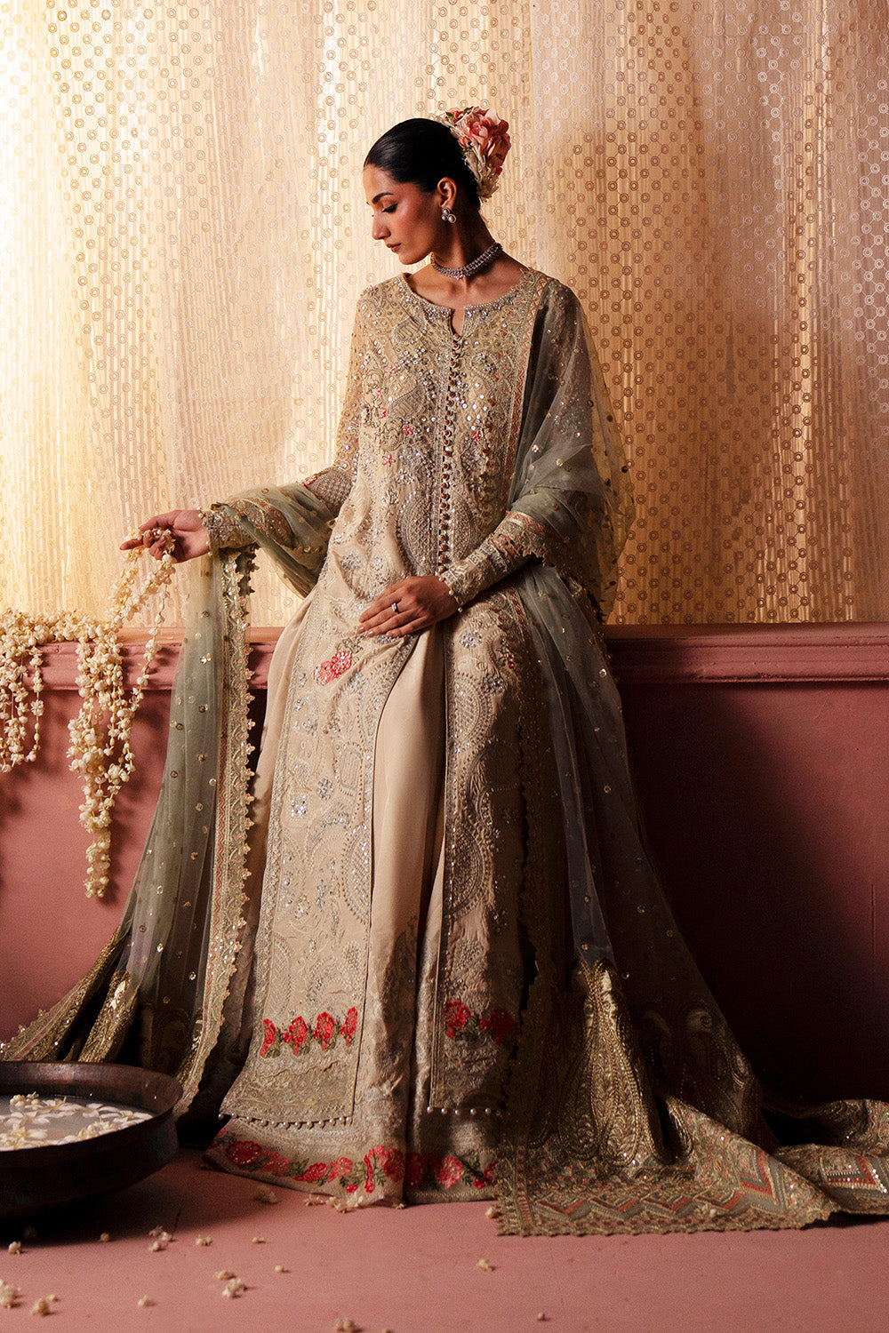 Step into refined elegance with this Whitecap Grey 3-piece pret ensemble, meticulously crafted in Silk and Bareeze Net for a graceful, couture-inspired look. The fully embroidered blouse dazzles with exquisite adda work, while the round neckline with a slit is enhanced by piping, fabric loops, and delicate embroidered buttons for a polished finish. Its fitted sleeves showcase a stunning center motif enriched with adda detailing. The ensemble pairs beautifully with a flared lehenga, adorned with multicolor applique work and intricate embroidered kalliyan, finished with contrast embroidered borders for a vibrant touch. Completing the look is a Bareeze net dupatta, featuring an all-over embroidery jaal and 4-sided borders accented with kiran lace a perfect blend of tradition and modern finesse.