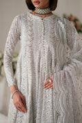 Grace your wardrobe with the ethereal charm of this Snow White 3-piece pret, featuring a full-length flared peshwas-style gown in sheer organza. The boat neckline with a subtle slit is adorned with lace finishing, fabric loops, and embroidered button detailing for a refined touch. Intricately designed with all-over chevron embroidery, the gown is further embellished with sequins, creating a luminous effect. The hemline continues the embroidery in graceful patterns, finished with a scalloped edge for timeless elegance. Fitted sleeves with full embroidery enhance the regal silhouette. Paired with straight grip trousers for a sleek balance, this ensemble is completed with a delicate net dupatta, finished with four-sided scalloped embroidered borders and scattered sequins. A lining is included for effortless wear, making this outfit a masterpiece of elegance and sophistication. 3 Piece Pret Gown Fabric: Organza Trouser Fabric: Grip Dupatta Fabric: Net Color: Snow White