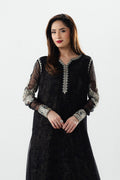 Elevate your wardrobe with this stunning 2-piece pret in timeless black. Crafted in luxurious georget chiffon, the long shirt features a round embroidered neckline with a front slit, all-over hand-printed lining, and delicately embroidered borders. Fitted embroidered sleeves add a touch of elegance, while the georget chiffon sharara with hand-printed lining completes this effortlessly graceful ensemble—perfect for festive and evening occasions.