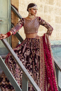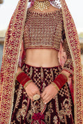 Parivarsh is the art of royalty on a dark maroon velvet canvas. With its round neckline & fitted three quarter sleeves, except for the majestic velvet fabrication, the lehenga choli is filled with so much embellishments that it looks like a walking ornament in itself. The whole outfit is heavily bejeweled with heavy hand adda embellishments all over including naqshi, dabka, payal, sitari work, cut dana, stone work & crystal hangings details & embroidery along with texture play, pattern work & delicate resham work on the bodice. The back of the choli is adorned with heavy handmade chunky tassels. The lehenga is adorned with heavily embellished repeated pattern on every panel finished with chunky layers of borders finished with facing. The dupatta is heavily adorned with adda embellishments and embroidery spread motifs, finished with thick embellished border, lace & screen printed facing for the complete majestic look. Outfit comes with a delicately royal potli bag adorned with embellishments, embroidery & handmade tassels.