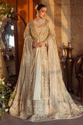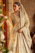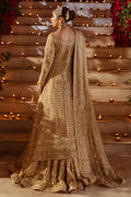 Paying ode to the old-world charm, Roshan Ara is the pinnacle of beauty! The 5-piece skin gold bridal outfit comprises of hand adda embellished & textured inner & plain voluminous tissue lehenga adorned with heavy layers of hand adda embellished & embroidered borders finished with lace & stiff facing. Now the showstopper is the heavily hand adda embellished composed gown featuring naqshi, dabka, payal, sitari work, cut dana, stone work & crystal hangings details & embroidery along with texture play, pattern work & delicate resham work along with heavy thread texture details & goti work & composed motifs on the front and back. The gown openings & hem are bedazzled with crystal work and the full fitted sleeves are adorned with handmade crystals with gown finishing comprising of crystals & stones as well. The heavily bejeweled dupatta is adorned with heavy hand adda embellishments & embroidered motif spread finished with chunky embellished borders & pastel contrast facing with finest finishing to give the bride that majestic look. Outfit comes with a statement structured clutch with embellishments & embroidery details.