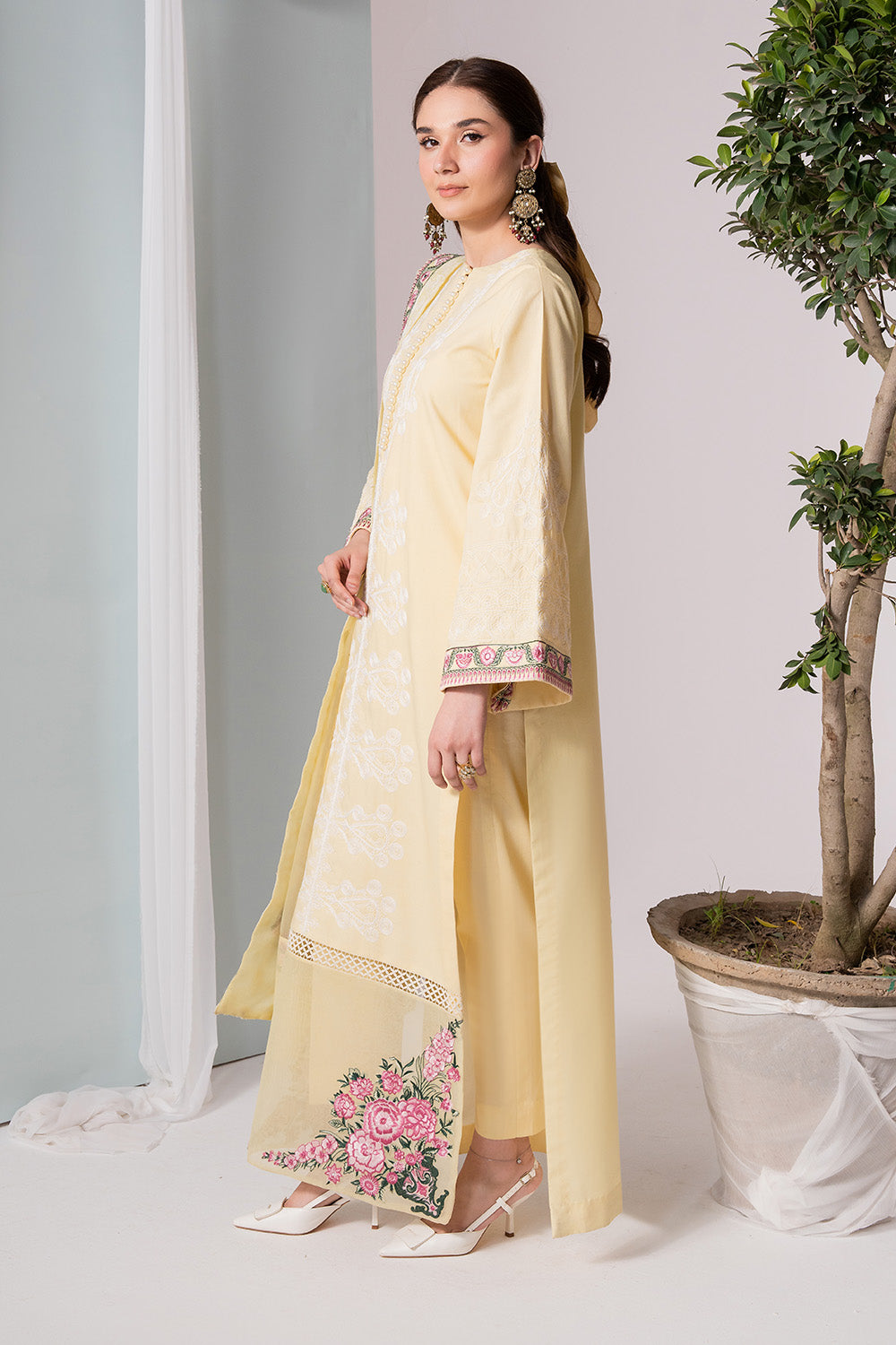 Drape yourself in the refreshing charm of this 3-piece pret set in Lime Yellow. The lawn, organza, and cotton shirt create a delicate yet refined look, paired with a flowy organza dupatta. Finished with soft cotton trousers, this ensemble is a perfect blend of style and comfort.