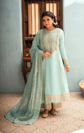 Dressed in a flowing mint green kalidaar long shirt with delicate embellishments and floral accents, she embodies a love that's gentle yet heartfelt. The kalidaar is artfully paneled to create graceful volume, while the neckline- elegantly hand-embellished with dabka adds a refined charm. The hem, lined with contrast floral borders, brings a poetic finish to the silhouette. Paired with delicately hand-embellished silk culottes and an ethereal organza dupatta adorned in floral motifs and subtle sitara shimmer, Aeda speaks to the kind of beauty that captures hearts.
