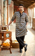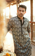This black hued kurta, crafted from silk fabric, features a symphony of multihead embroidery, illustrating lyrical floral vines in beige. Elevate your Eid celebration with this sophisticated ensemble, a harmonious blend of tradition and contemporary allure.