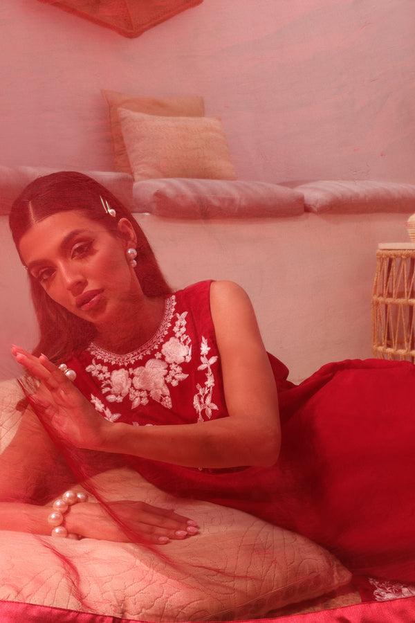 Spellbinding and captivating, RENISA is a decadent red ensemble designed for any event. This exquisite outfit features a double-neckline shirt adorned with intricate embroidery and stitching details at the corners. Paired with a pure organza embroidered dupatta and a solid shalwar, RENISA embodies elegance and sophistication, ensuring you make a stunning statement wherever you go.