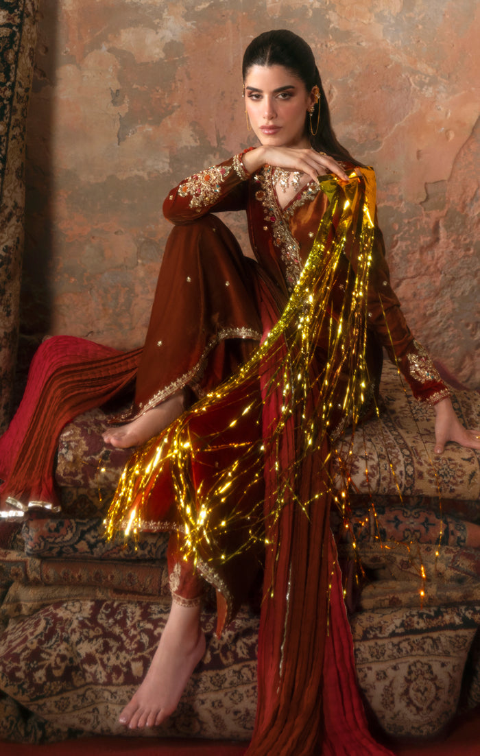 Promising burnt orange elegance, NAME is an enchanting harmony of time-honoured crafts composed on a sumptuous, burnt orange velvet canvas. The angrakha style shirt showcases a delicately hand embellished bouquet pattern will dabka tilla and resham stitches. Each motif is further heightened by gota accents that bestow the ensemble with a majestic grace. Paired with a dazzling silk crushed two toned dupatta, comes with a embroidered culottes.