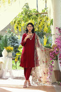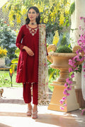 This gorgeous Bordeaux coloured kurta is elegant and flattering. Paired with our signature MH embroidered dupatta, it is everything you need for that elegant night out! The set comes with shirt, pants and dupatta