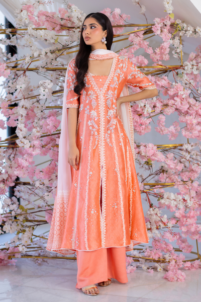 Our signature Mina Hasan block print is paired with gorgeous pearl and diamante details in this striking peach outfit! With beautiful and delicate work throughout, this piece is easy to dress up or down for many occasions! Complete it with a matching block print dupatta.