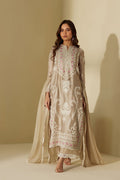 Look graceful as ever in this long straight shirt that features delicate floral theadwork throughout the shirt with light hues on the neckline. The outfit is competed with ezaar pant and a matching chiffon dupatta.