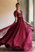 Radiate in this empire waist maroon pishwas. The outfit features a floral embroidered bodice and delicate crystals on the sleeves. The pishwaas features a stone work trellis throughout the lehnga and is completed with a matching maroon dupatta.