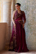 Be a vision in this burgundy and gold lehnga saari. The outfit features a blouse that has carefully placed crystal beads in a scallop shape with flower embroidery in the middle. The blouse is beautifully paired with a gold floral emrboidered saree that features threadwork, dabka and sequin work. The saree is features a spray of sequin chhan to complete this glamorous look.