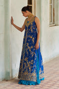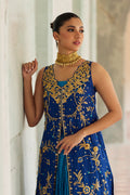 Look absolutely majestic in this royal blue front-open jacket. The outfit features a glistening cutwork neckline with chinoiserie-inspired embroidery throughout the jacket. The jacket is paired with a matching blue slip and crushed lehenga underneath.