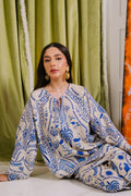 This sophisticated co-ord set features a cool beige base adorned with an eye-catching, intricate blue print inspired by classical Grecian motifs and mythical creatures. The ensemble comprises a short, loose-fitting tunic with delicate bell sleeves and a keyhole neckline, paired with matching cropped, wide-leg trousers. The breathable fabric and relaxed, flowing silhouette offer supreme comfort while maintaining a uniquely chic and striking aesthetic.