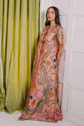 This magnificent kaftan drapes elegantly in a soft tropical blush hue, serving as the perfect backdrop for a vibrant, all-over signature print featuring lush botanical motifs, stylized palm trees, and ornate borders in striking multi-hues. The free-flowing kaftan silhouette ensures an incredibly easy and comfortable fit, allowing for graceful movement while remaining effortlessly chic. Finished with a decorative V-neck and playful tassels, this piece is an absolute statement of effortless luxury, perfect for any sophisticated occasion.