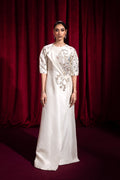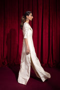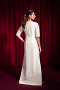 Gown and trouser in Indian Raw Silk Embroidery of Tilla ,Sequence ,Resham with Crystal , sitra, nakshi ,Pipe, Bajra moti and Batique work On Neck L sleeves