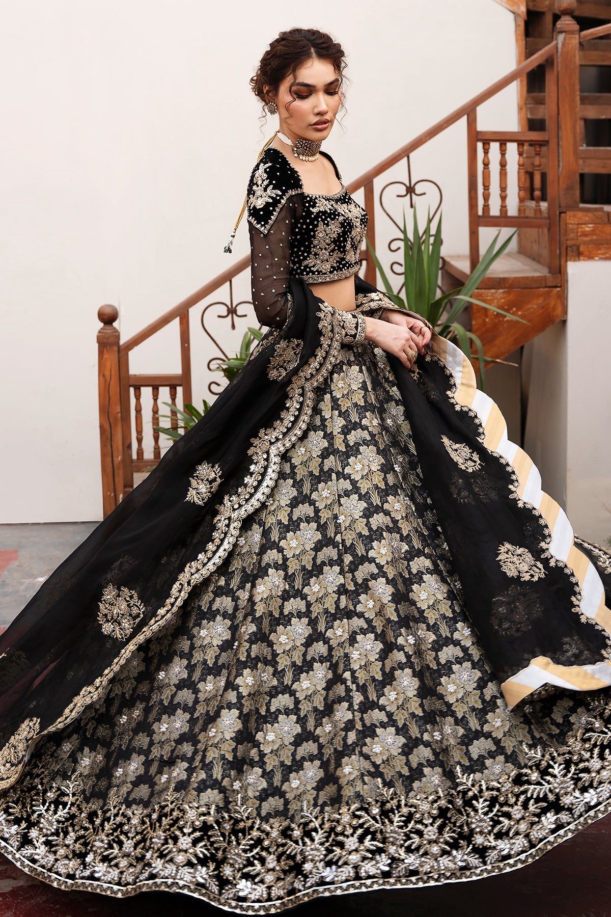 A tapestry of elegance woven with tilla and sequins, resham threads, and pure zardozi artistry. Embellished with the brilliance of Swarovski, kora, dabka, nakshi, crystals, pearls, and sparkling sitara work, each element speaks to timeless luxury and handcrafted beauty