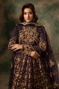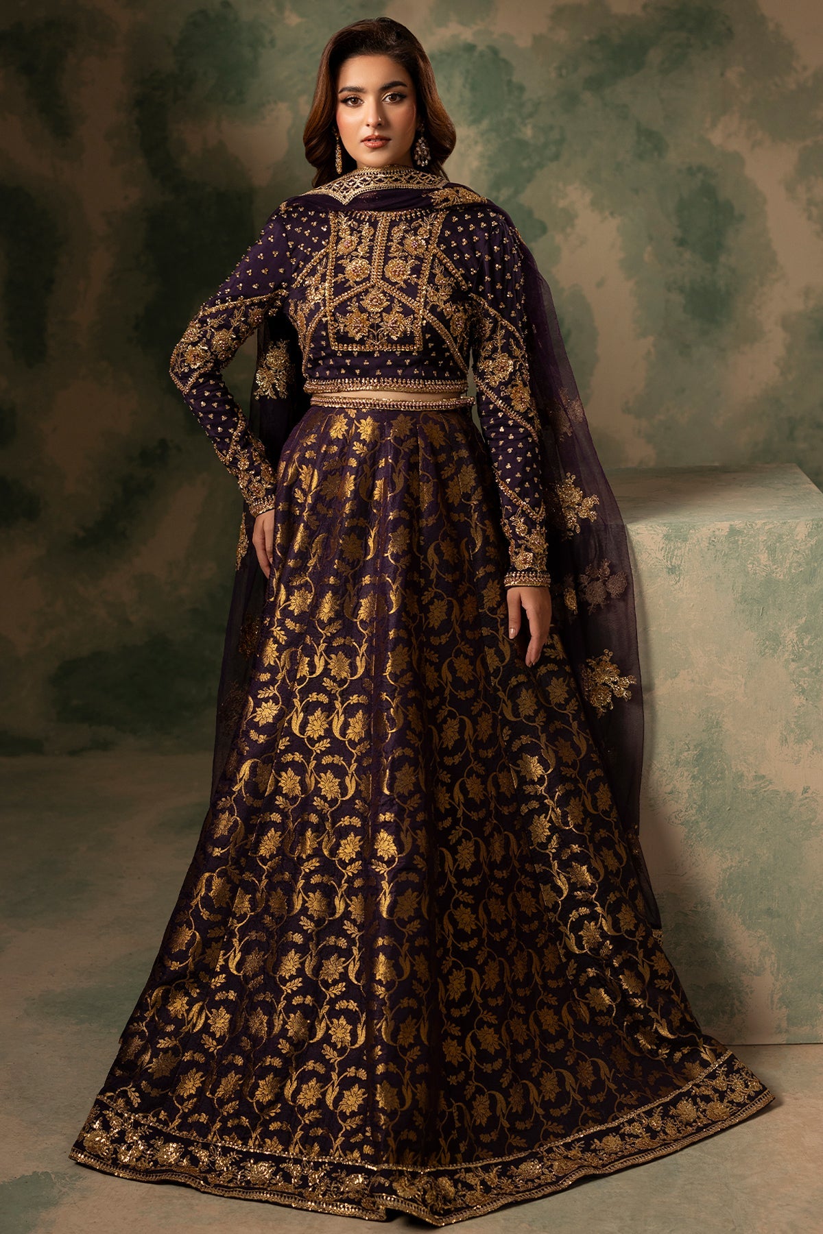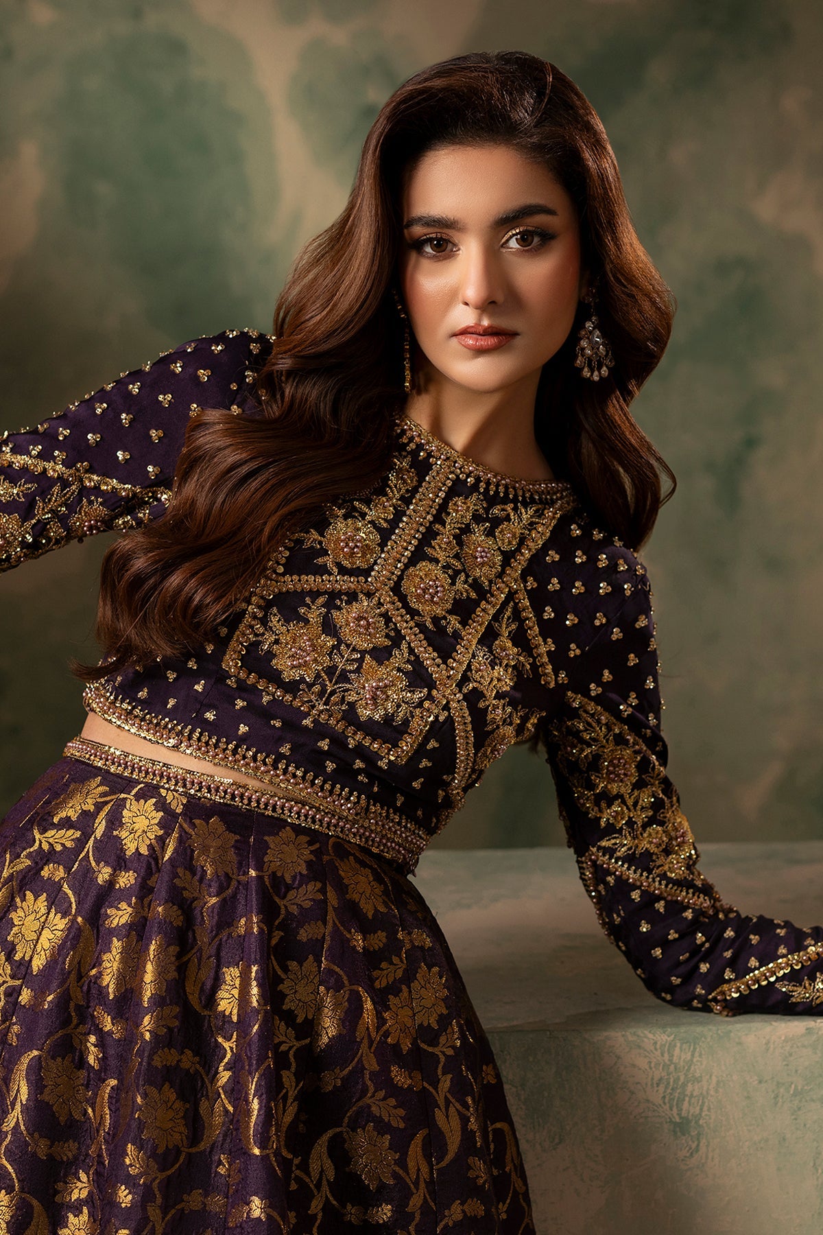 A dark purple, beautifully constructed blouse paired with a net dupatta and a brocade lehenga. The heavily embellished bodice features dabka, pearls, and Swarovski crystals, reflecting a perfect blend of artistry and tradition. This ensemble carries the grace of age-old banarsi craftsmanship, celebrating timeless elegance with a classic traditional touch.