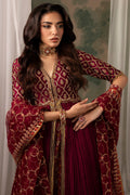 A maroon front-open jacket pishwas, exquisitely embellished with dabka, nakshi, Swarovski, and crystals, paired with a jaal net dupatta inspired by Mughal geometric patterns. The ensemble is completed with a lower lehenga featuring two distinct printed patterns, also inspired by Mughal art, creating a harmonious blend of traditional artistry and contemporary design.