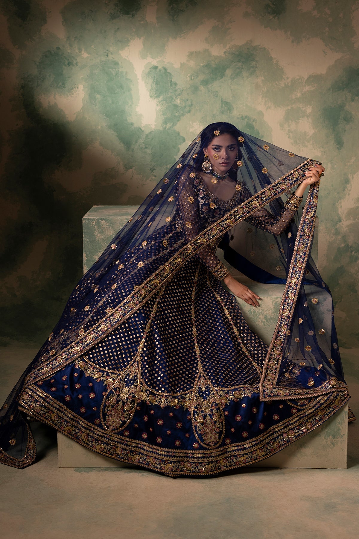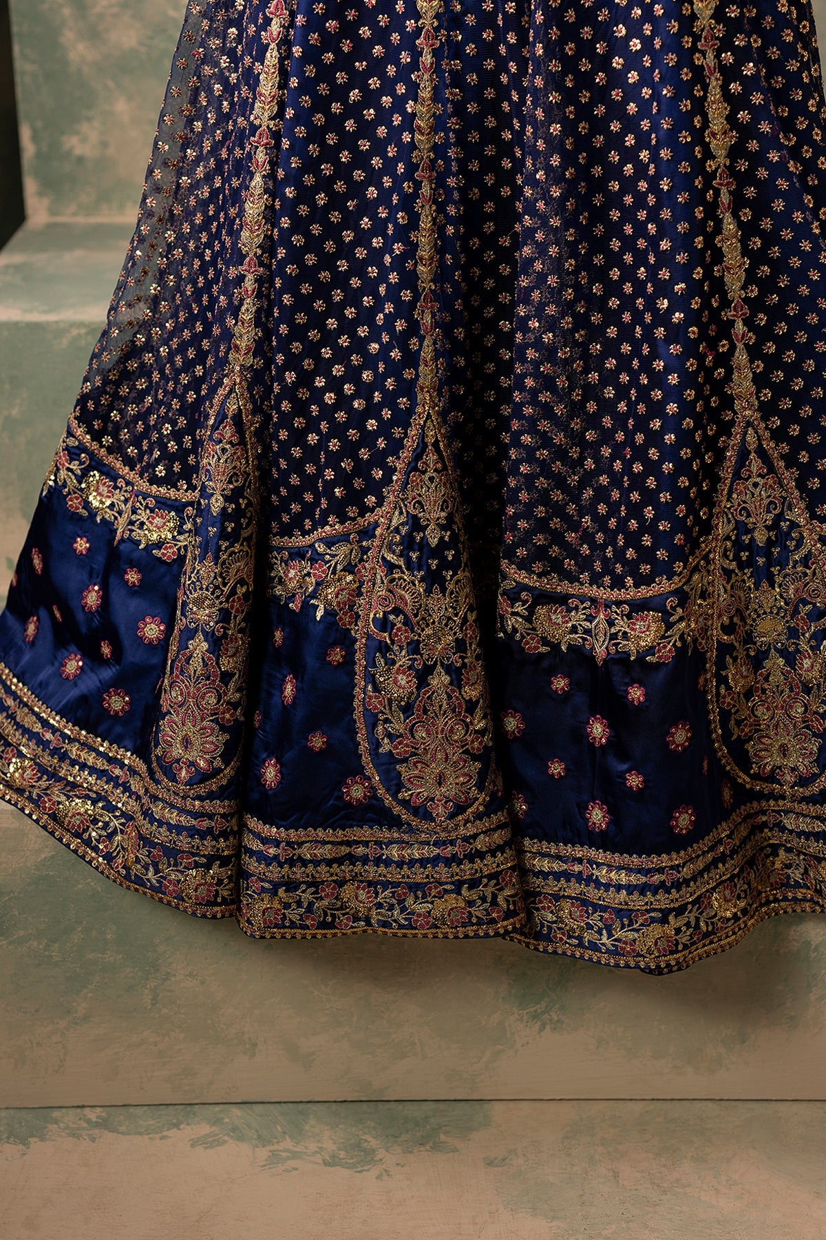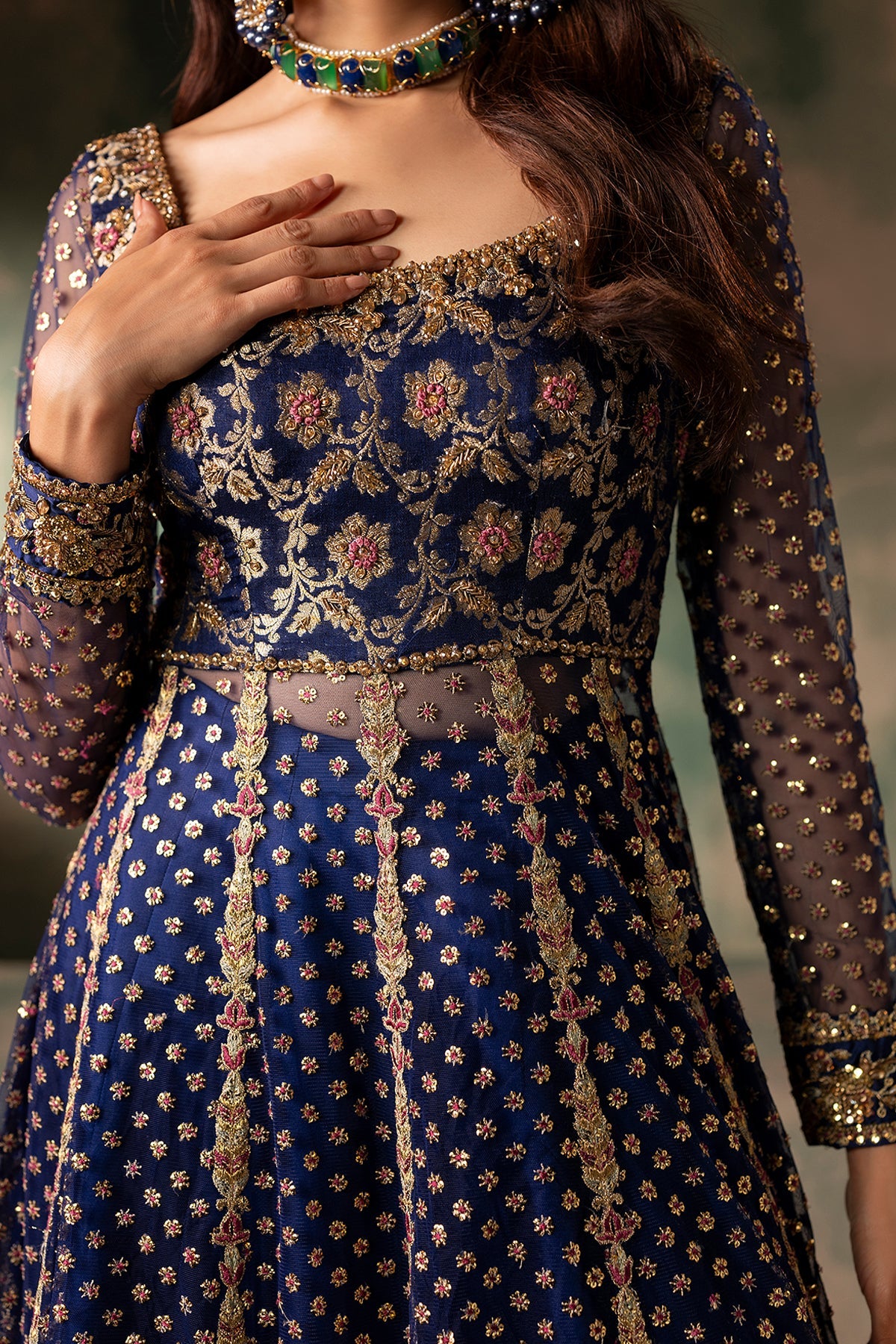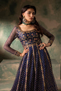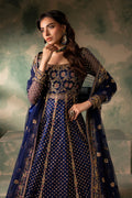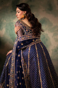 A sophisticated blue brocade bodice paired with an embroidered silk and nek kalidar lower, complemented by a beautiful matching dupatta and silk lehenga. The ensemble is delicately embellished with dabka and Swarovski, featuring hand-done resham embroidery, reflecting a perfect blend of elegance and artisanal craftsmanship.