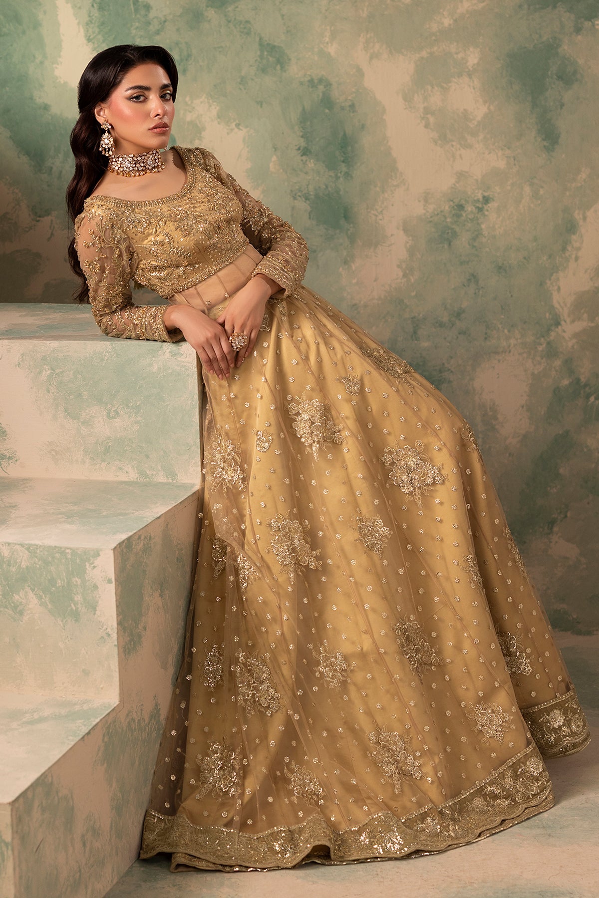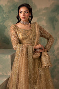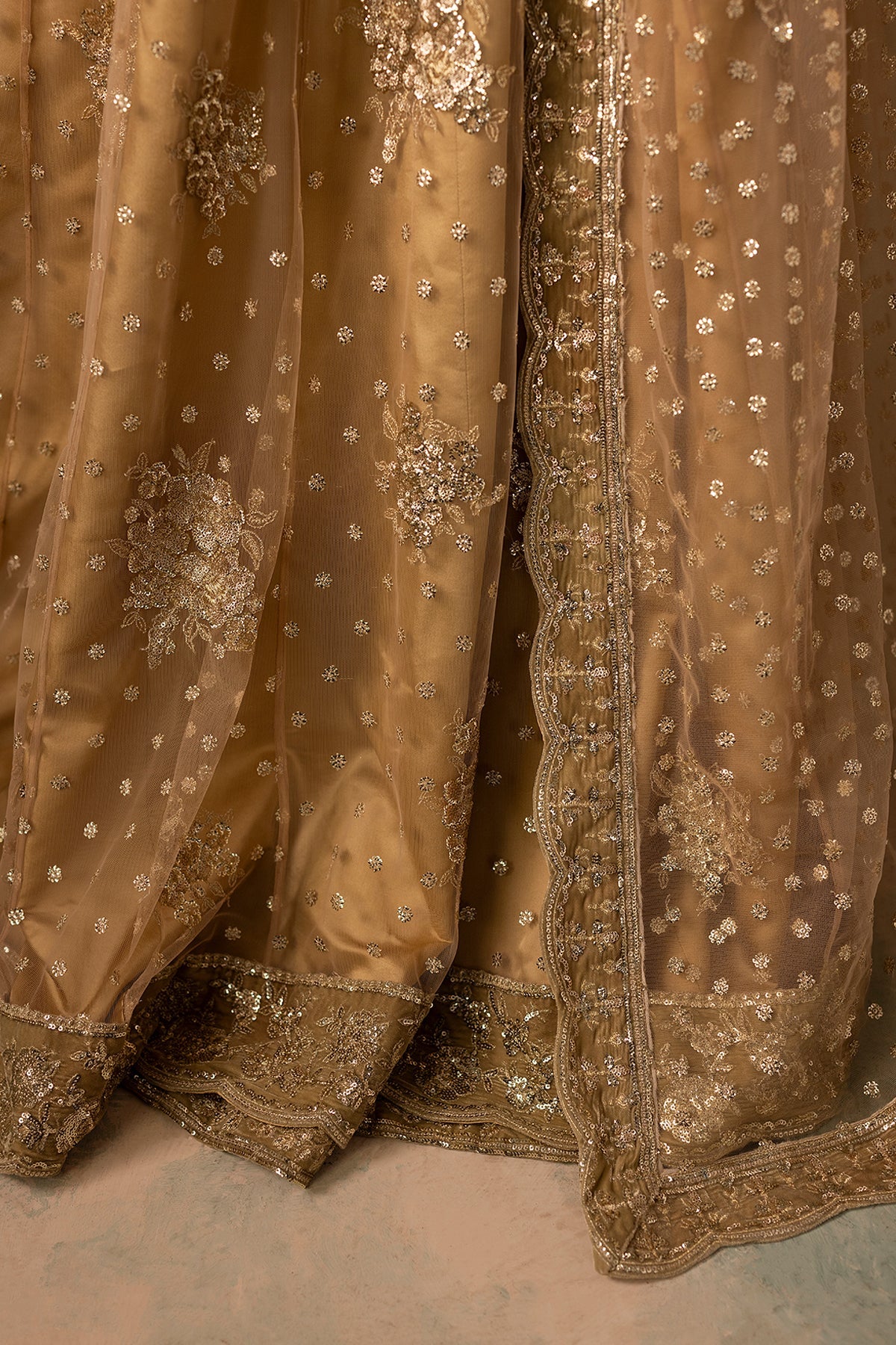 A gold glittering net pishwas, exquisitely embellished with dabka, sequins, Swarovski crystals, and katdana, paired with a silk lehenga and a net dupatta. The lehenga, pishwas, and dupatta borders are all finished in luxurious velvet, adding depth and opulence to the ensemble.