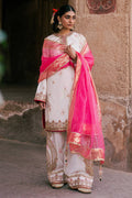 Bayaan – A pristine white cambric shirt, gracefully adorned with a delicate border and intricate adda work that reflects timeless craftsmanship. It is paired with a cambric shalwar, enhanced with embroidered borders and subtle motifs for added elegance. The ensemble is completed with a Kacha Tila organza dupatta, lending a soft shimmer and refined festive charm to this classic look.