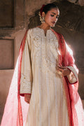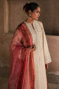 Sakoon, An ivory cambric printed shirt, elegantly adorned with detailed borders and a beautifully defined neckline, enriched with delicate adda work for a handcrafted finish. It is paired with a classic cambric chooridar, offering a sleek and timeless silhouette. The look is completed with a single chaan organza dupatta, finished with a printed border that adds a soft festive accent to this serene and refined ensemble.