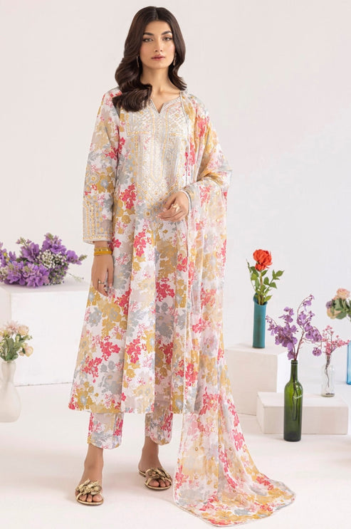 PRINTED FLORAL 3PANEL SHIRT IN SILK LAWN FABRIC ADORNED WITH DELICATE & FINE PATCHED EMBROIDERY MOTIFS FOR SLEEVE & NECK-LINE