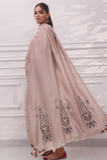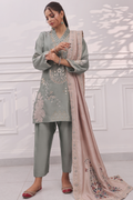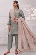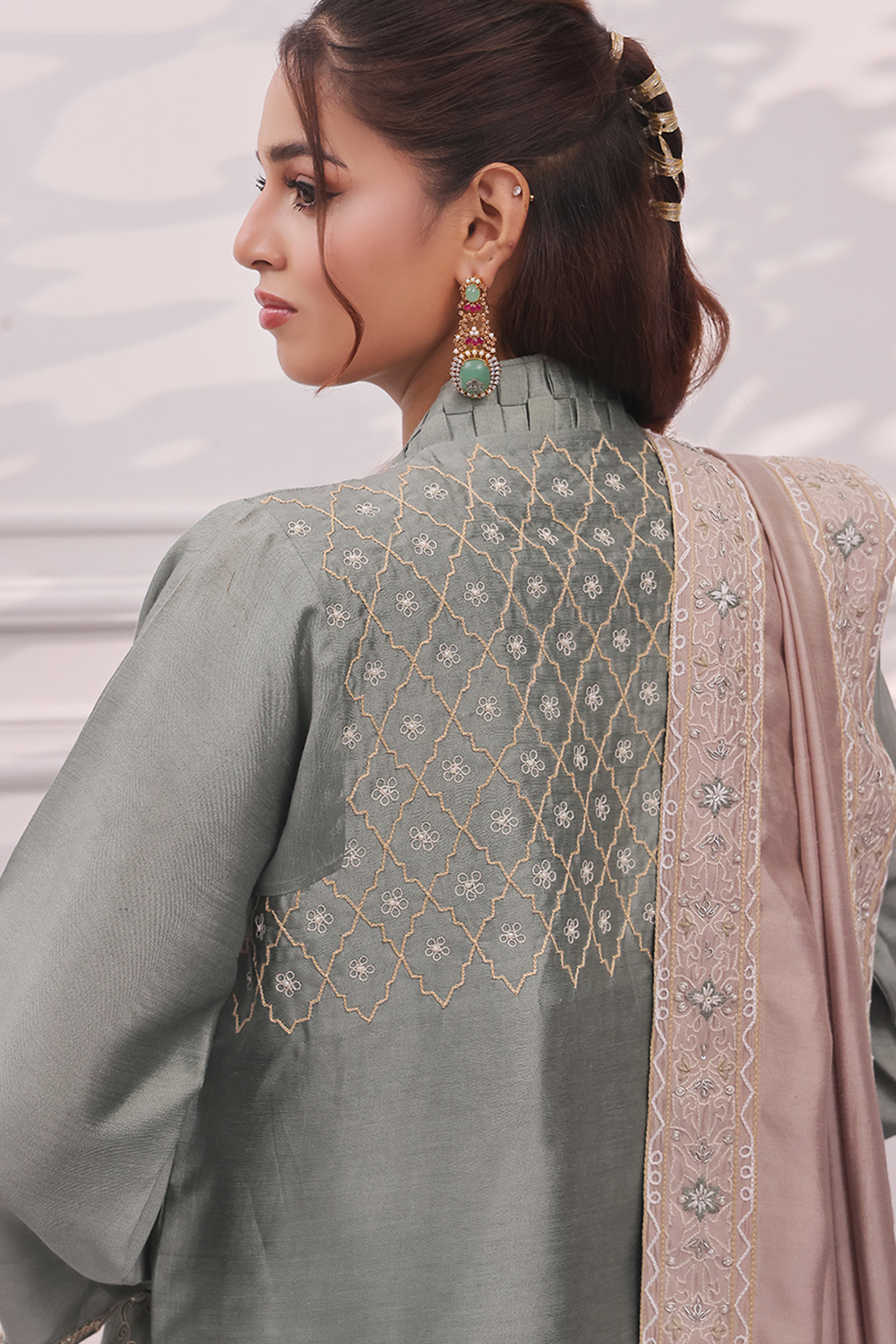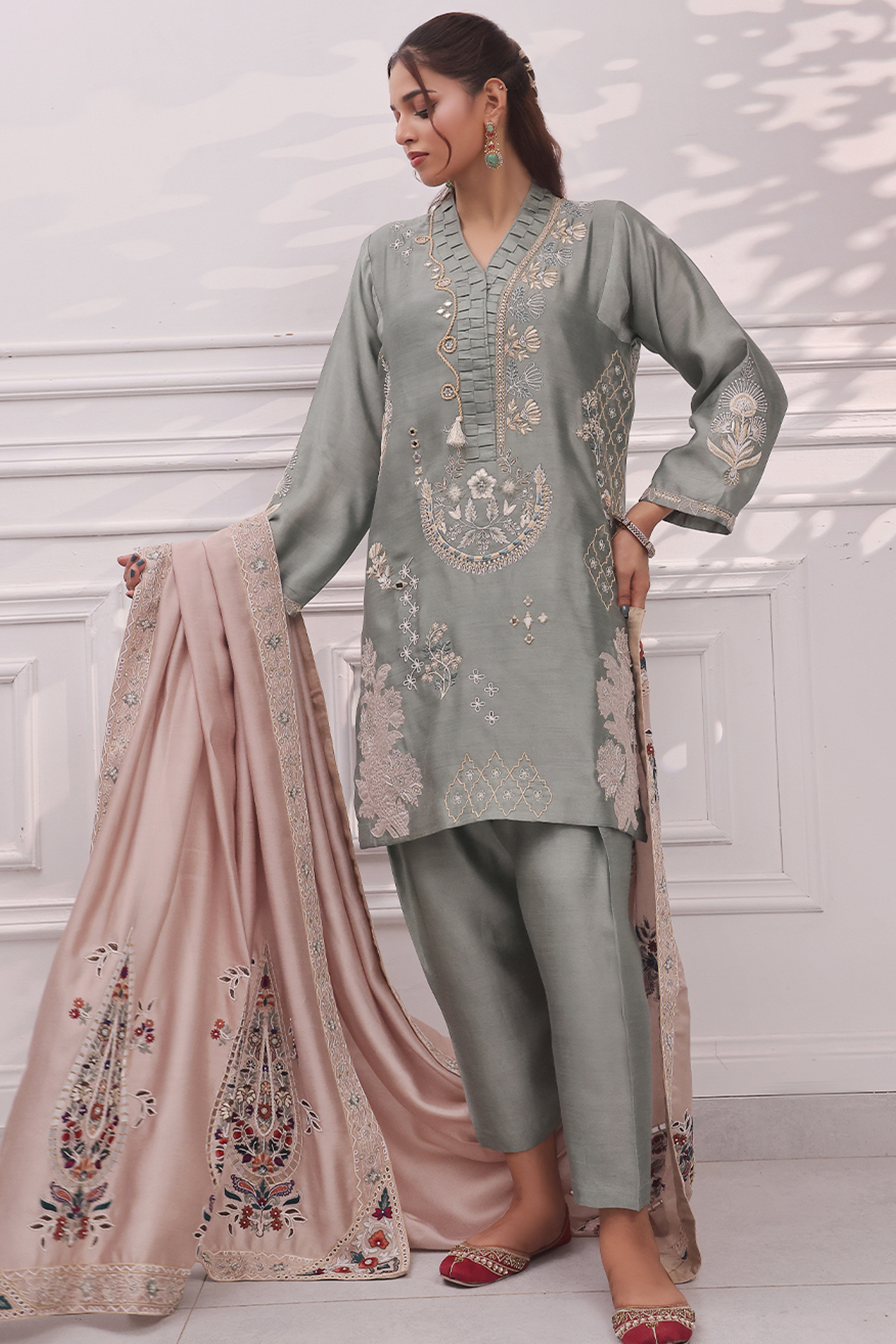 Sage green shesha silk meets masterful craftsmanship in this luxurious ensemble. The shirt features delicately hand-embellished motifs with resham and pearl work, offering a rich, textured finish that speaks to timeless tradition. Paired with a beige contrast dupatta adorned with vibrant multi-color embroidery, this look strikes the perfect harmony between softness and celebration. Finished with sleek straight pants, this outfit is designed for graceful movement and effortless sophistication—ideal for festive gatherings that call for something truly special.