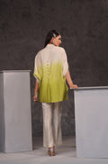 Expertly crafted Sitara is made of pure sheesha silk in a baggy style featuring shades of ivory and lime green. Embellished with Swarovski crystals, pearls, and stones, it includes a front line of buttons. Accompanied by a variety of pants options such as bell bottoms, pants, or polazo, this garment offers luxurious elegance.