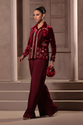Fusia pink short jacket with hand embellishment kora dapka work adorn with diamonties in front open style with high coller Comes with straight shape airline pants.