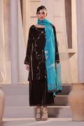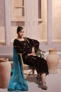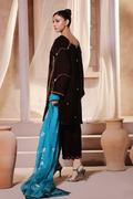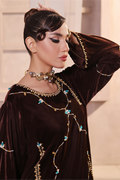 Chocolate brown french velvet in kurta style adorn with froza stones and gold campaign stones work adding its beauty with pearls Comes with straight cut polazo with cutwork on bottom line Pairing it with friza pure plorganza duppta with brown resham embroidery all ovar