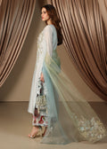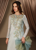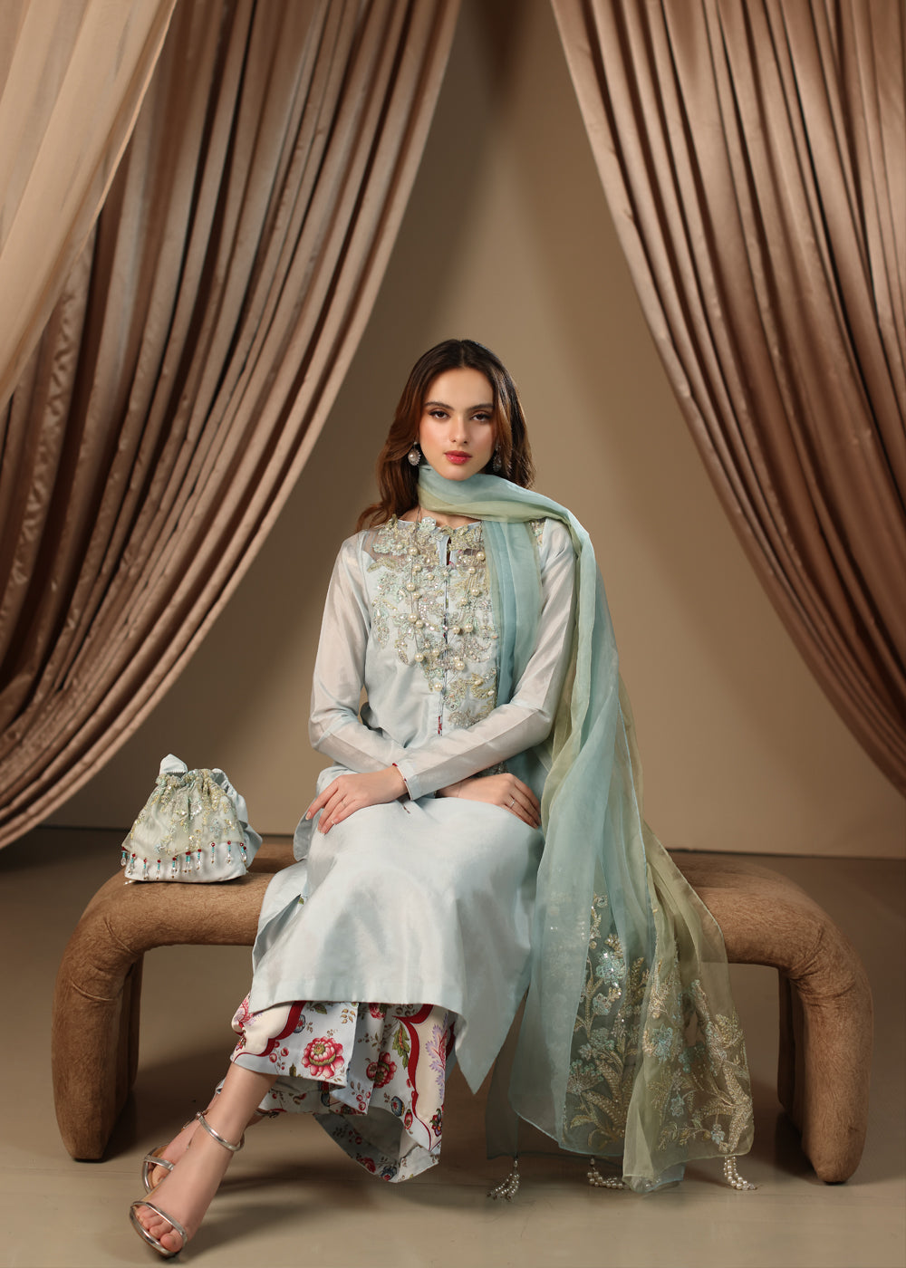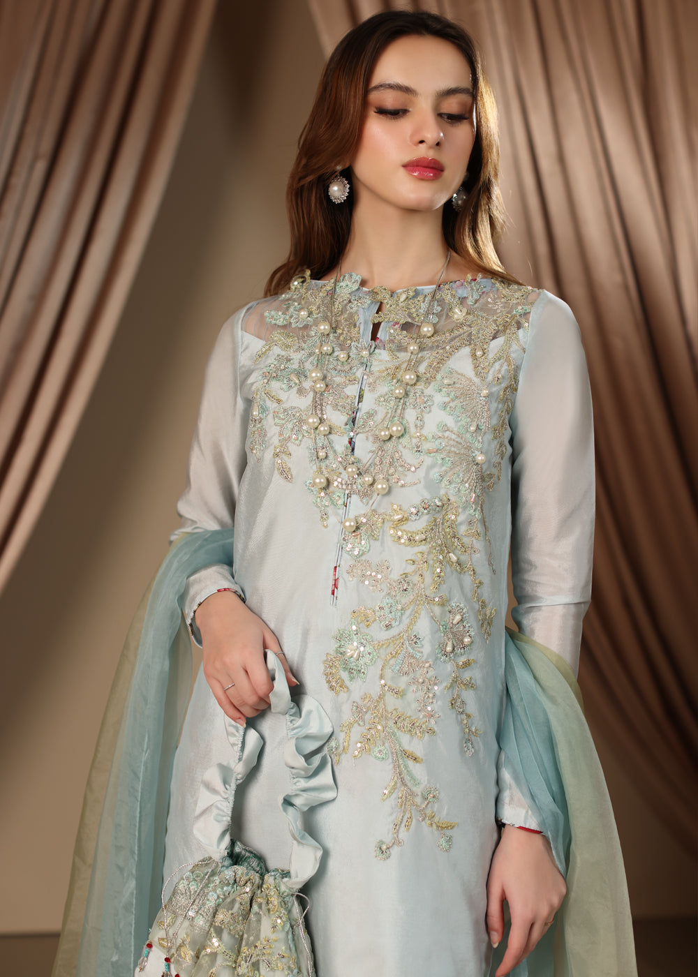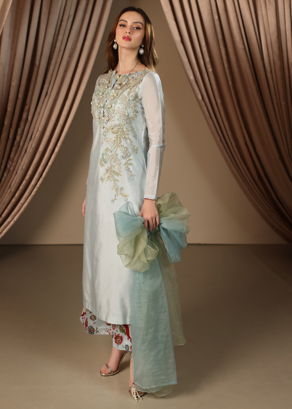 “Ariana” is a fresh fusion of modern flair and intricate craftsmanship. The premium tissue silk shirt features asymmetrical embroidery, delicately worked with silver tilla and shaded resham in contrasting hues. Hand-embellished with pearls in varied shapes, the design brings texture and sophistication to every detail. The pleated organza neckline is finished with a pop of digitally printed silk — a chic twist on tradition.