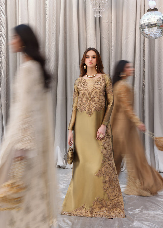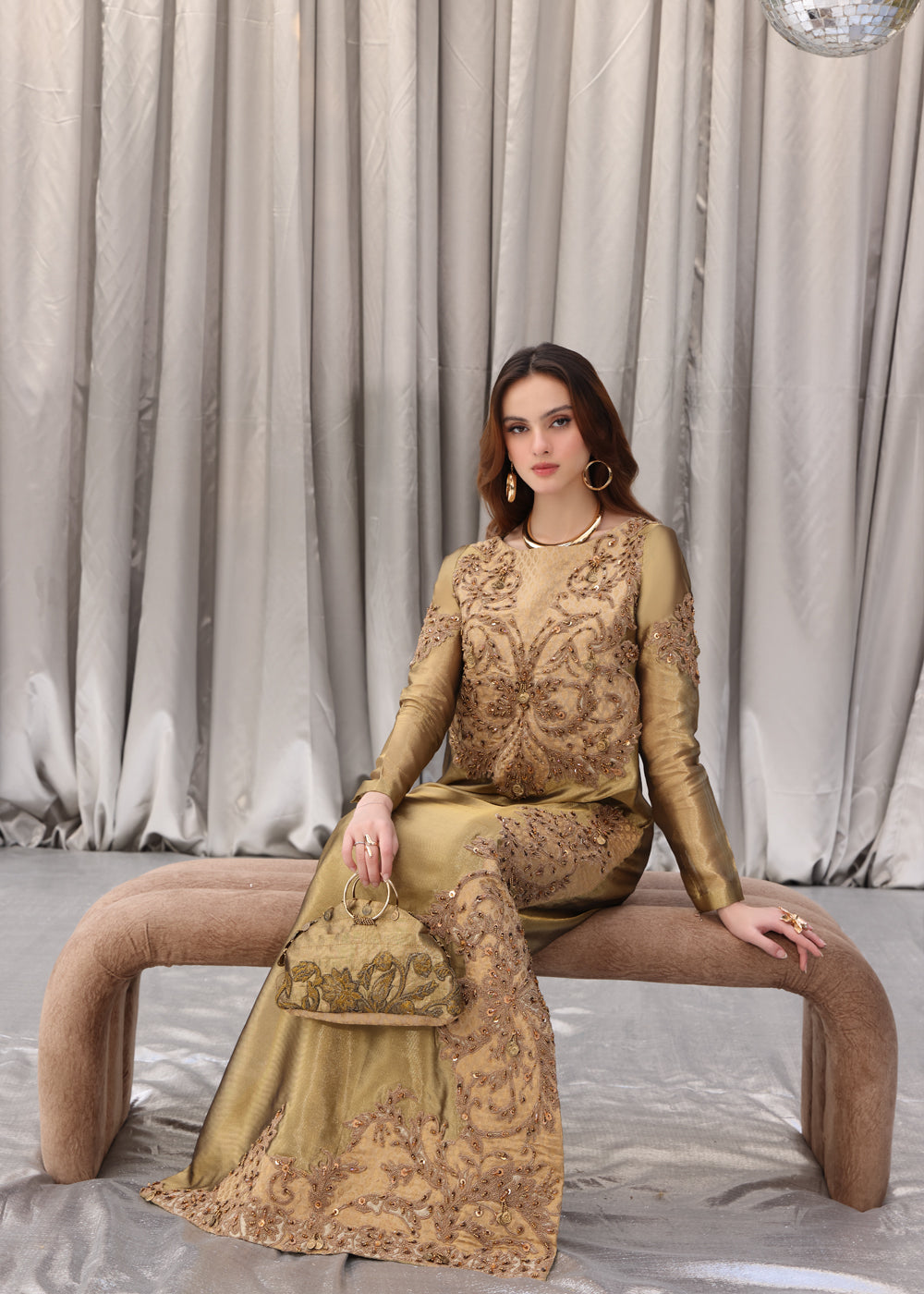 “Princess Solara” is a tribute to golden grandeur, reimagined with a modern soul. This exquisite kaftan is a masterful fusion of shimmering tissue and opulent Kimkhab, rendered in rare antique gold hues that radiate royalty. The silhouette is elevated with intricate Dori embroidery and lavishly hand-embellished using sequins, crystals, and antique coins — each detail telling a story of timeless elegance.